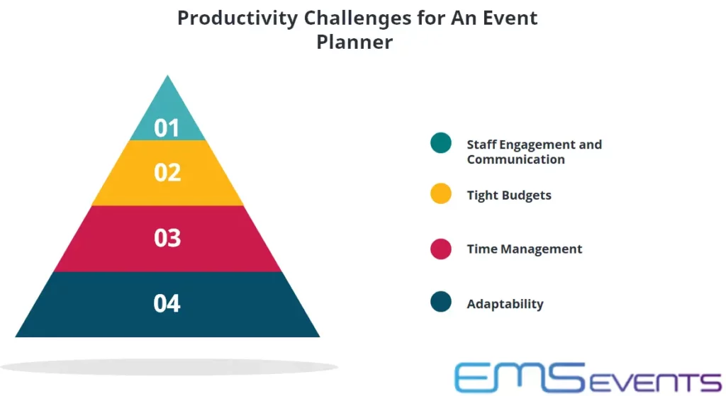 Productivity challenges are always there for event planners when it comes to producing the best events. They mainly distract them from the event plan and cause less productivity in the event planning and management team. A few of the critical ones are as follows;